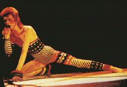 OK. I love David Bowie. I think he is the coolest guy who ever came to us, everything he does is cool. His acting, his art, and yes, even his music is beautiful. I also love 80s music. Made In The 80s, Choose 80s, The Best of Blondie, I love it, can't get enough of it! What I don't love is those wonderful "cool" people out there (you know who you are) who decide that its not "cool" enough or it's not "punk rock" or whatever they say, to like this music, or to go to raves and have FUN, or to have preppy friends that you've known and loved since you were 5, but in the words of bratmobile "fuck you too! cool schmool!" I like these things. I like to go to raves with some friends and just hang out and dance and have fun times. female bonding. and I like my friends. Just cuz some of them don't like my kind of music or they don't like to go to all ages shows with me anymore I still love 'em. I know this is gonna sound like I'm bitching AGAIN but I really gotta say this. I can't stand when people say they have an open mind about everything and they say they just do what they want and they want people to stop making fun of them but then they do the same thing! They are constsntly making fun of me becuz of my David obsession (did you know he changed his name from David Jones so he wouldn't get confused for Davey Jones from the Monkees? hehe...) It bugs me becuz how can you complain about something you do yourself? Well I just had to say that becuz I felt it was important, and think about if you do it, too. I know I have done it, without even noticing, making fun of people who went to the backstreet boys concert, or my good friend Stacie who I'm gonna start a band with having Hanson and Spice Girls stuff, but I try not to. And There is nothing wrong with David Bowie, except his recent change over to industrial doesn't really suit him. But the girl who directed the "Little Wonder" Video is my favorite video director ever. She did Anna Is A Speed Freak by Pure and that is my favorite video ever!